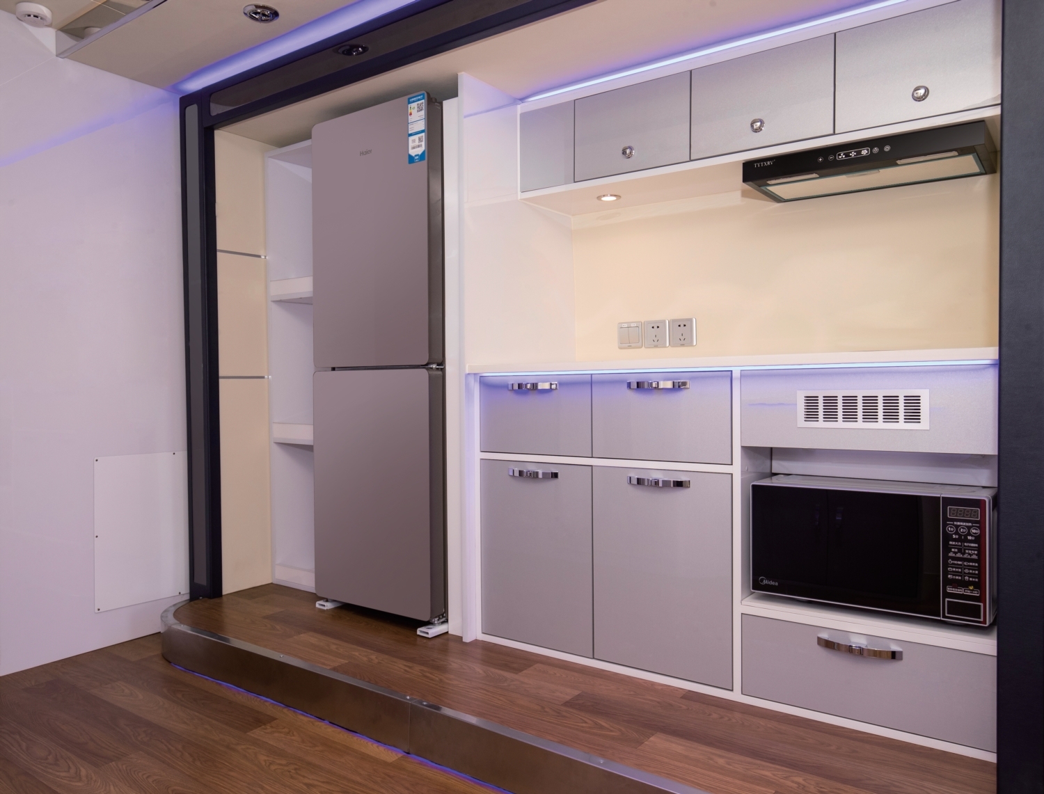 廚房內(nèi)嵌190L房車冰箱,冷藏冷凍均可,旁邊壁柜儲物空間豐富實(shí)用。