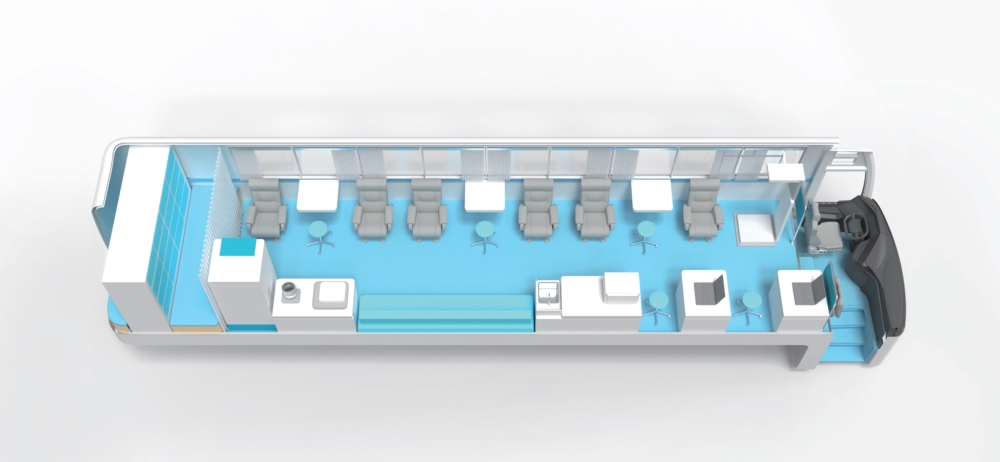12米大巴客車平臺(tái),車內(nèi)空間寬敞,搭載市電空調(diào),配備3個(gè)采血位和6個(gè)采血椅,配有微波爐、食品冰箱、飲水機(jī)等生活設(shè)施,設(shè)有應(yīng)急休息床,可最大限度保障獻(xiàn)血者的舒適度和人身安全。此外還可裝配拓展倉(cāng),拓寬車內(nèi)采血空間。