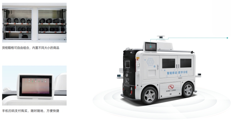 金龍 MOSO (MOBILE STORE) 自動駕駛售賣車是金龍針對公園、 景區(qū)、 酒店和工業(yè) 科技園區(qū)等場景打造的“移動迷你商店”,車輛能自動行駛、轉(zhuǎn)彎、臨?;蚶@行障礙 物, 可實現(xiàn)規(guī)劃定點停車、 固定路線巡航和預(yù)約停車等。MOSO 可在晴天、 陰天、 輕度霧霾及小雨等多種氣候條件下運營,高效提供商品售賣和廣告投放服務(wù),有效提 升智慧園區(qū)游客的科技體驗和便民服務(wù)需求,通過高清觸摸屏選購商品,微信、支付 寶支付,快速完成商品的購買體驗,讓人們感受“移動新零售”帶來的便捷。