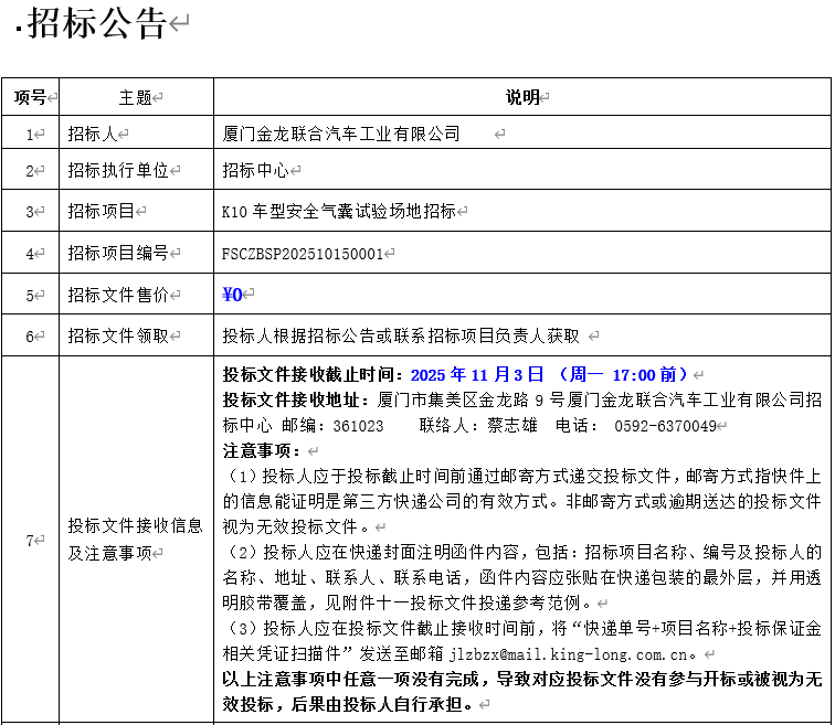 公開招標(biāo)招標(biāo)公告-K10車型安全氣囊試驗場地招標(biāo)